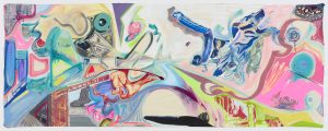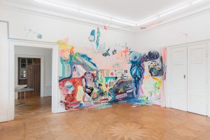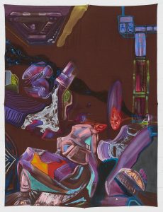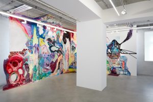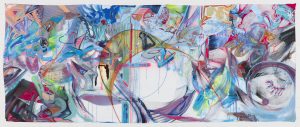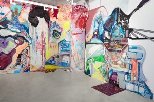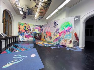 Bei diesem Werk ging es um Grenzüberschreitungen im analogen 2D und 3D, wie auch im digitalen virtuellen Raum. Diese Arbeit bestand aus einer 360° raumgreifenden Malerei, bei der der ganze Raum mit diversen Stoffen aus dem Fundus von Ulusoy´s Eltern bespannt war und mit verschiedenen Malmitteln bemalt wurde. Diese wurde dann mit Hilfe der `Creative editorin` Elisa Gassen in eine Virtuelle Realitätswelt übersetzt, in der man sich interaktiv frei bewegen konnte. Aus dieser digitalen Welt wiederum werden zusätzlich 3D Objekte, zum Teil lebensgroß, gedruckt und in die physische Installation integriert.